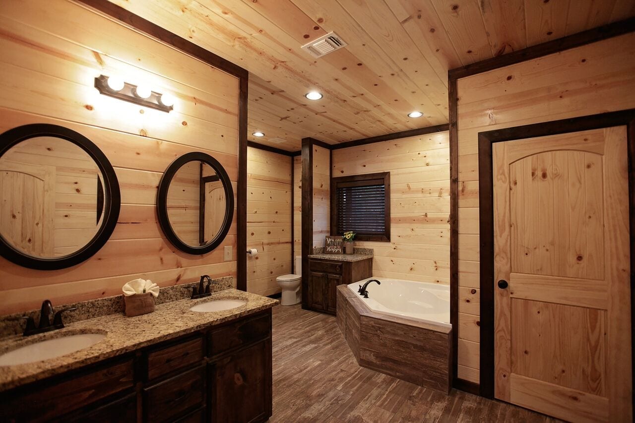 Cabin bathroom with dual vanity sinks, separate tub and shower, fireplace, television