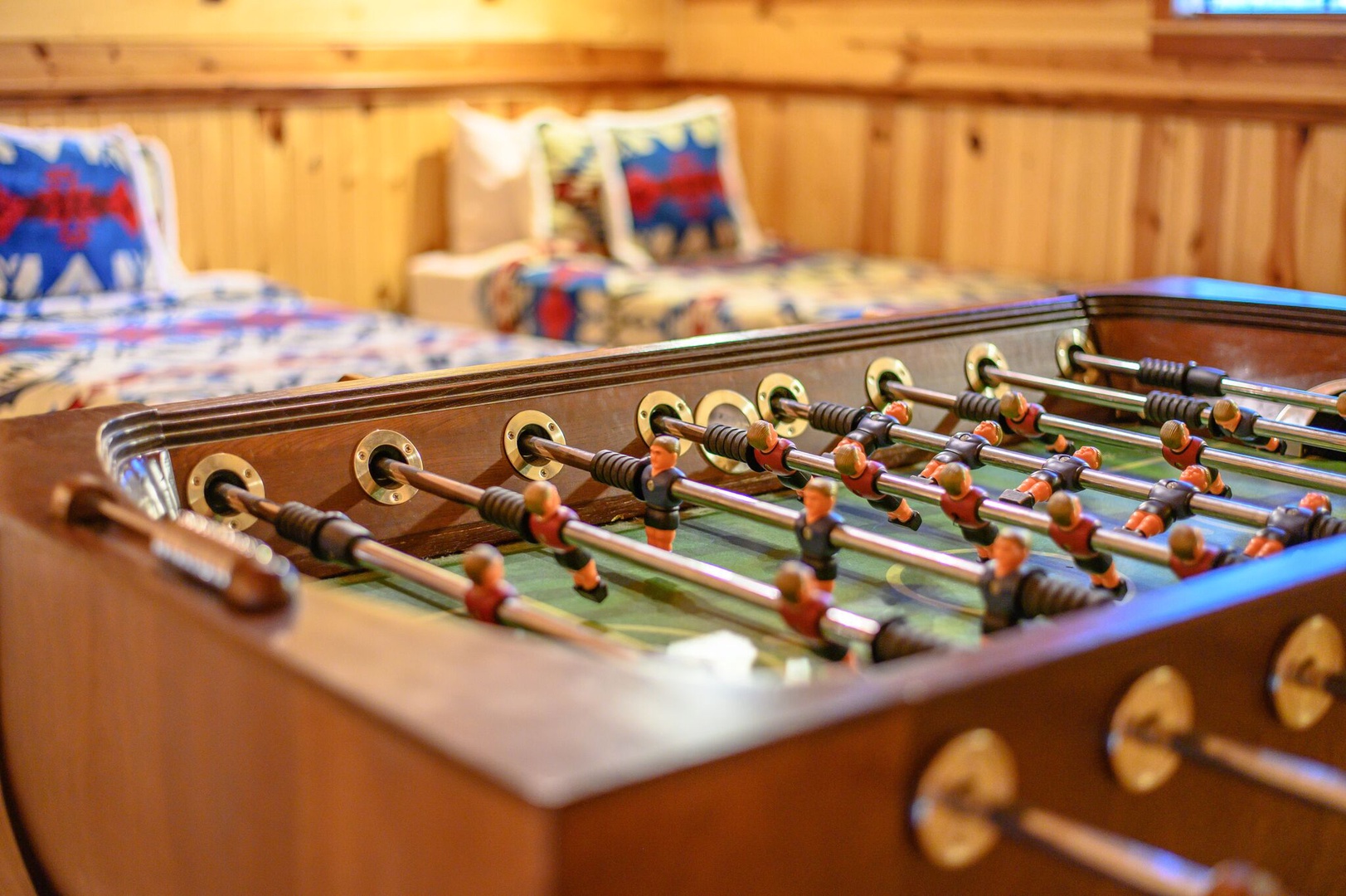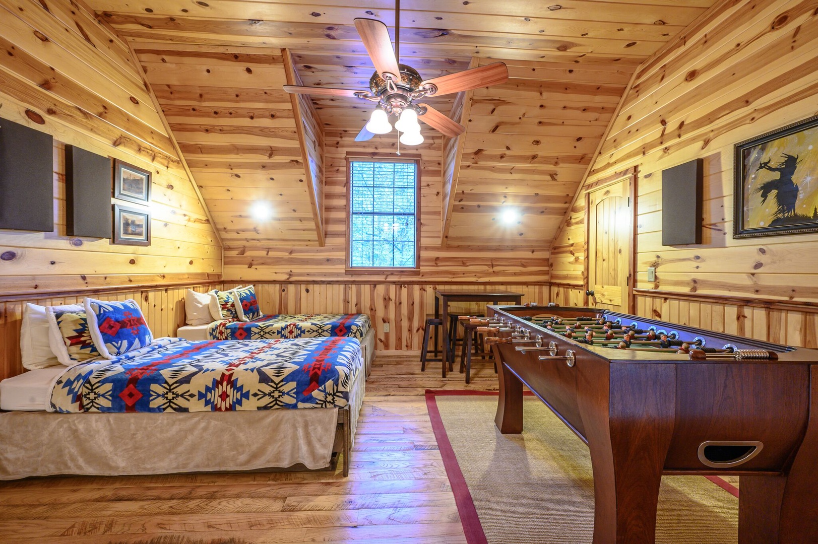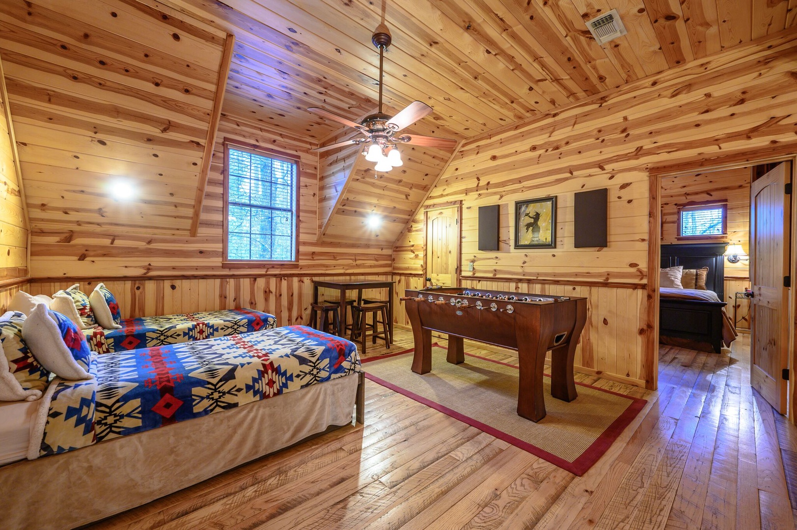There are two downstairs Master Bedrooms, each with their own King Bed, luxury linens, and private bathrooms that offer custom tiled walk-in showers. The large upstairs bedroom has a King bed, one twin bed, LCD TV/DVD, and a large full size bath that is shared with the game room. The upstairs game room has a foosball table, game table for four, and 2 twin beds. Downstairs there is a laundry room with full size washer and dryer.