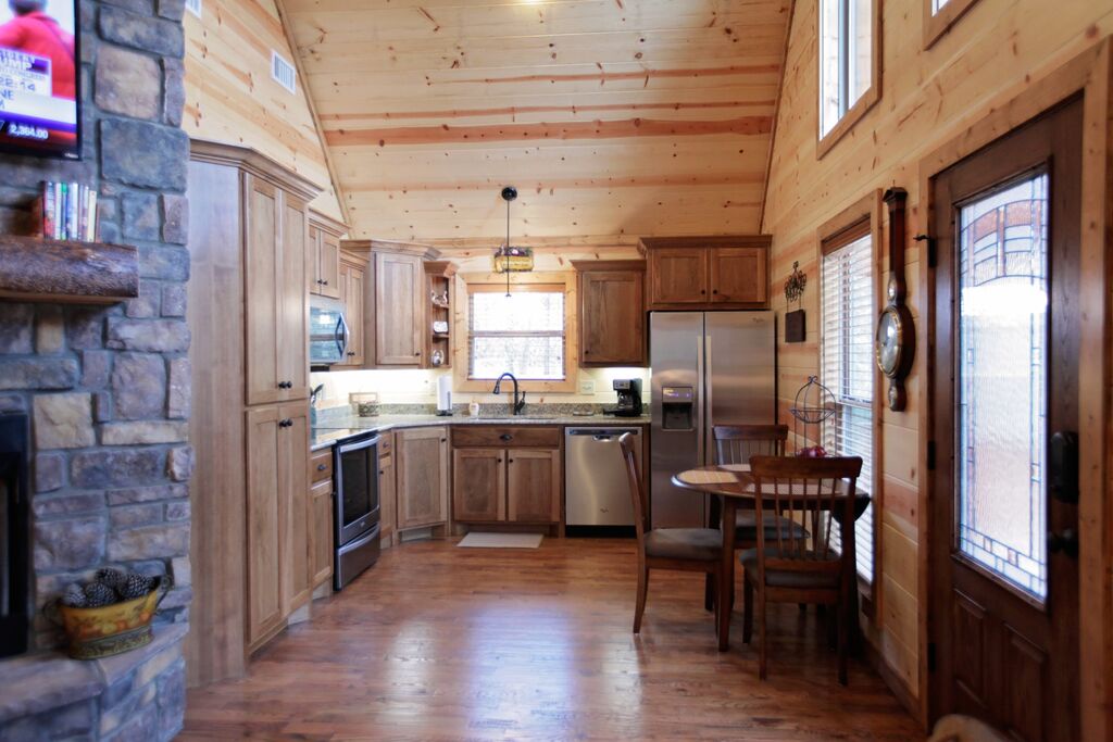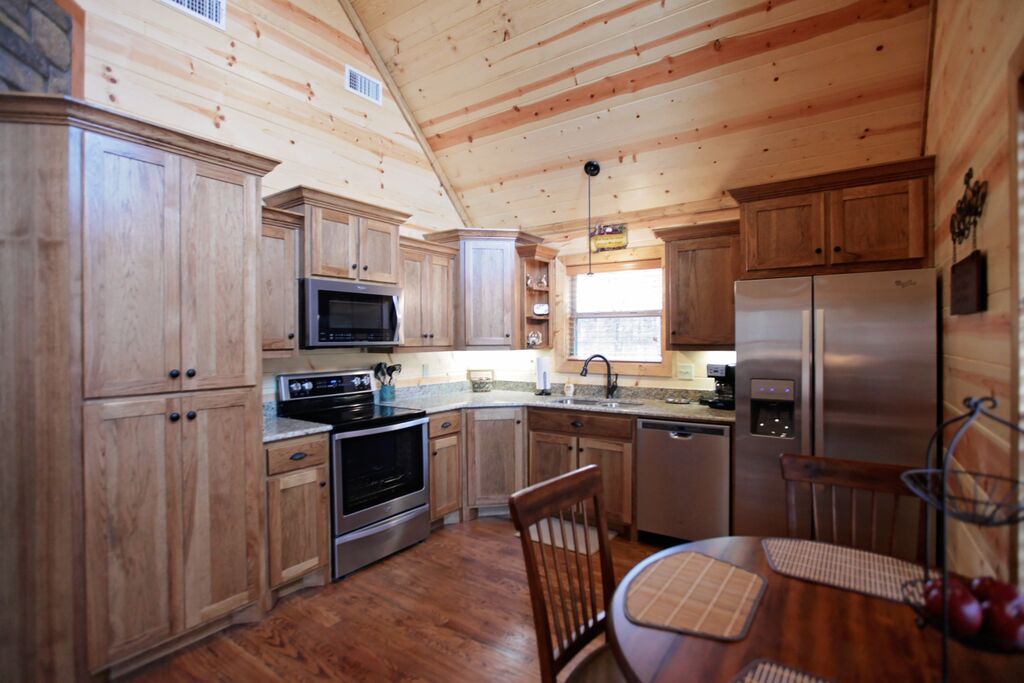The living area features a large screen television over a stone fireplace. The kitchen features stainless appliances and granite counter tops. You can either relax outside in front of the gas burning fireplace, or enjoy a quiet evening in the hot tub while enjoying the fireplace as well.